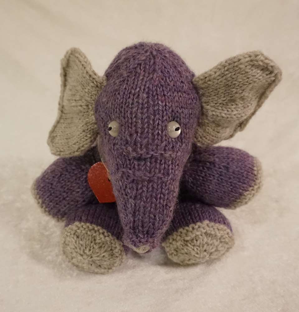 Strikka, lilla elefant. Ca 20cm høy, sittende.Myk ull. Med lite skinnhjerte rundt halsen.